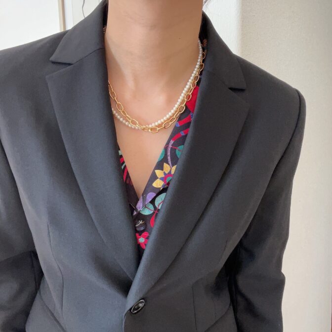 無地のカーディガンやジャケット、スラックスと合わせてオフィススタイルにしたり、デニムやロングスカートと合わせてカジュアルにも。