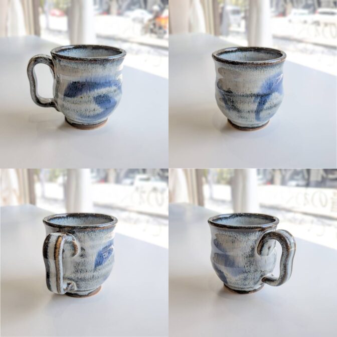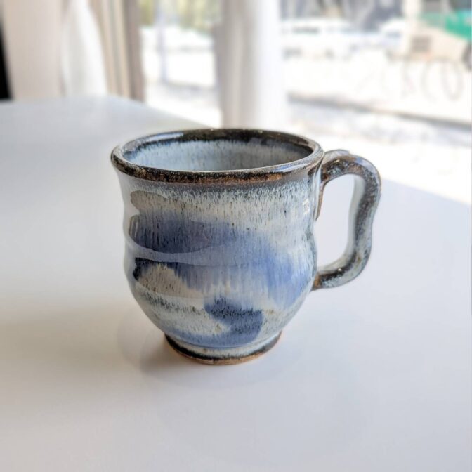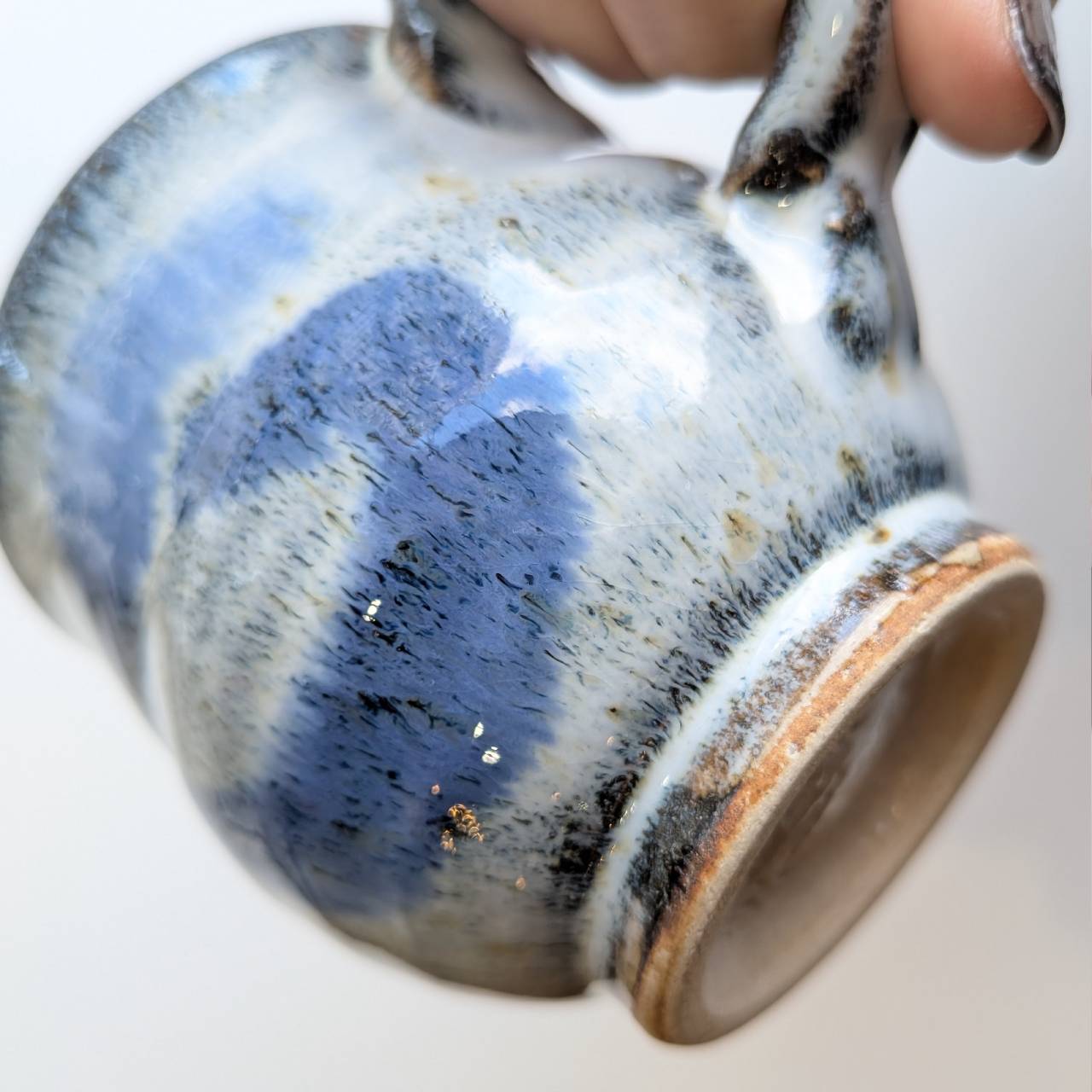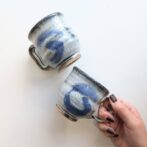 カップの内側と外側には、雄大な蔵王連峰の雪解けをイメージさせるような釉薬の流れがあり、外側には鮮やかなブルーの線掛けがポイントに。