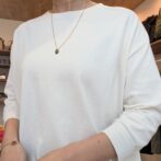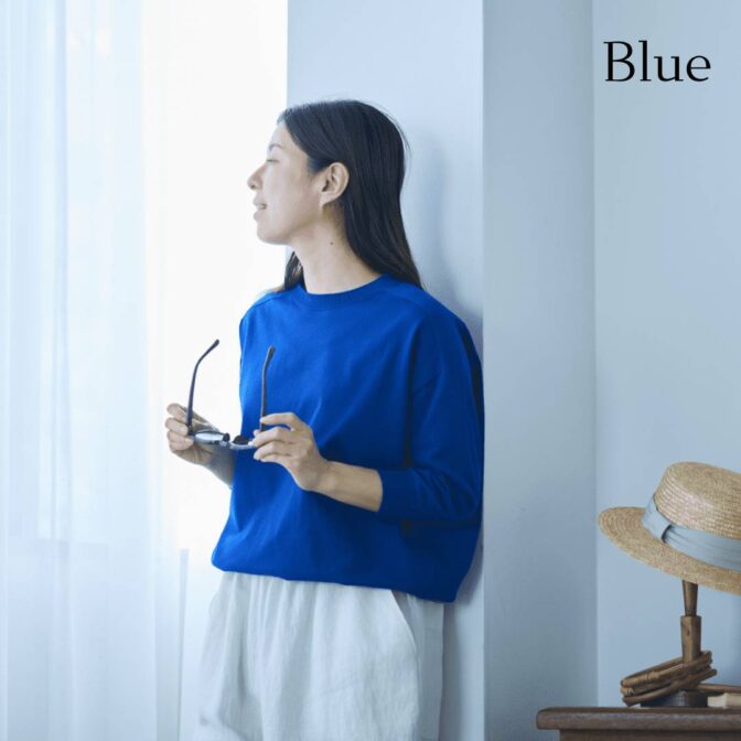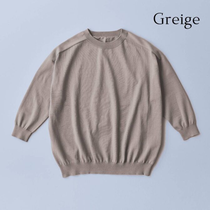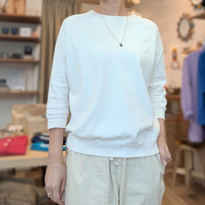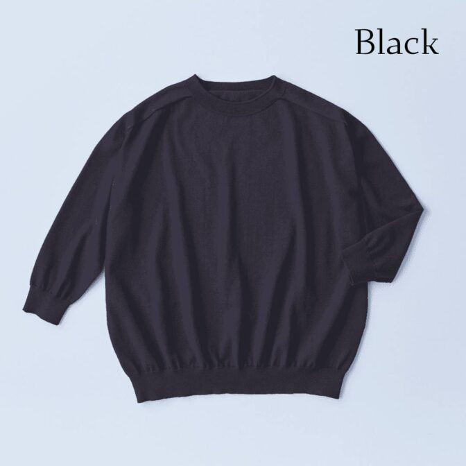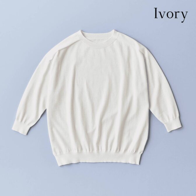 綿100%の薄手のニットで、すっきりとしたクルーネックが特徴の七分袖ニット。