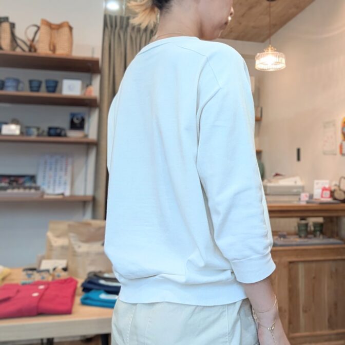 サイズはフリーサイズで身幅にはゆとりがあり、ラグランスリーブのため肩幅を気にせず着て頂けます。