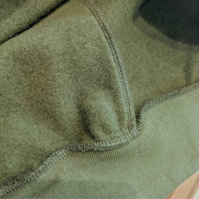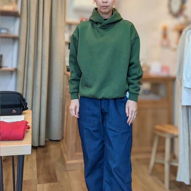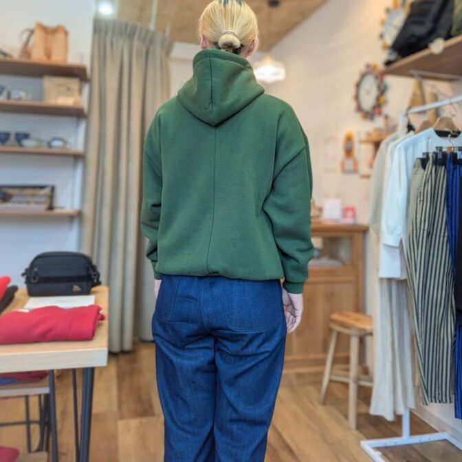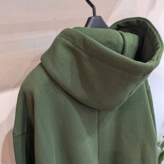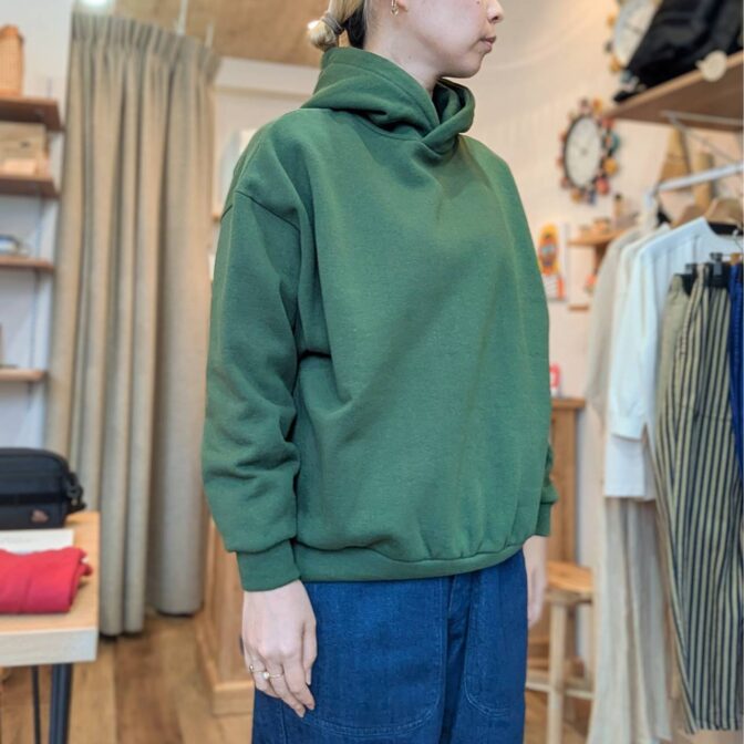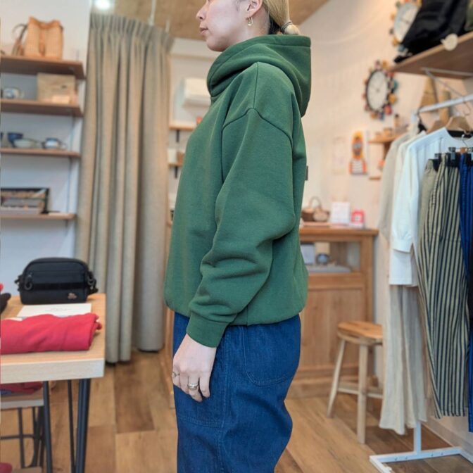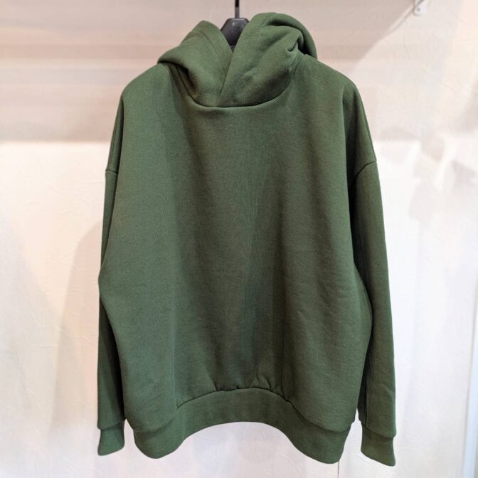 よくあるフロントポケットやフードの紐を付けないことでカジュアルな要素を減らし、年齢を重ねていっても着れるパーカーに仕上げています。