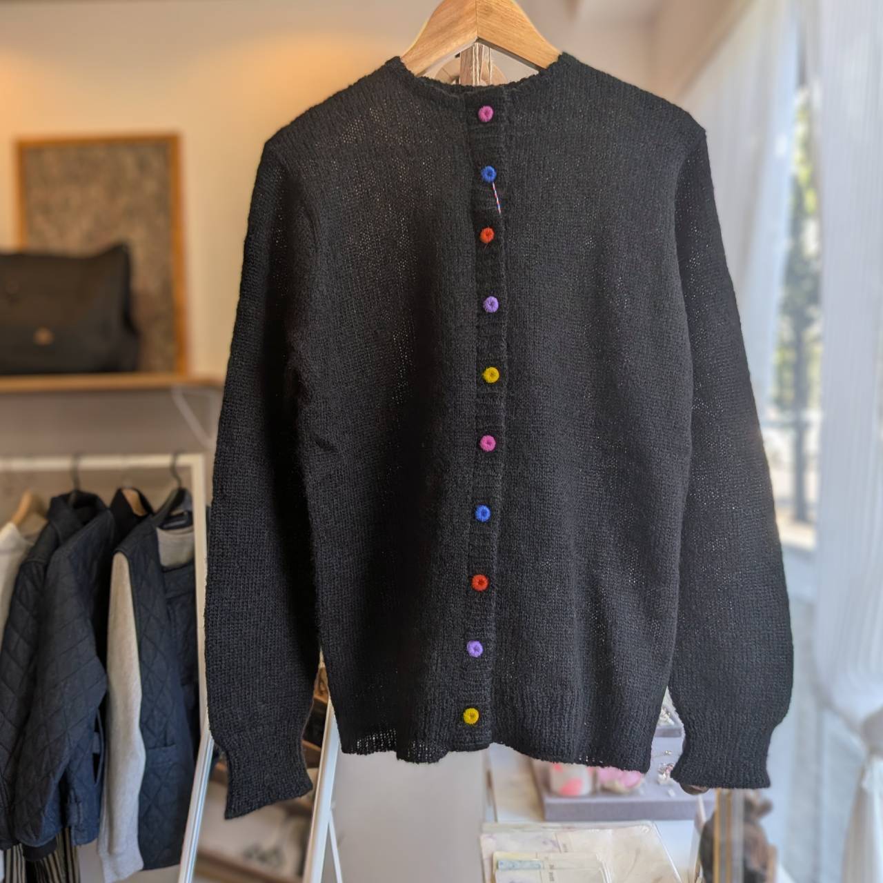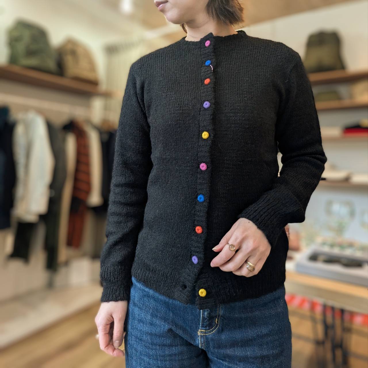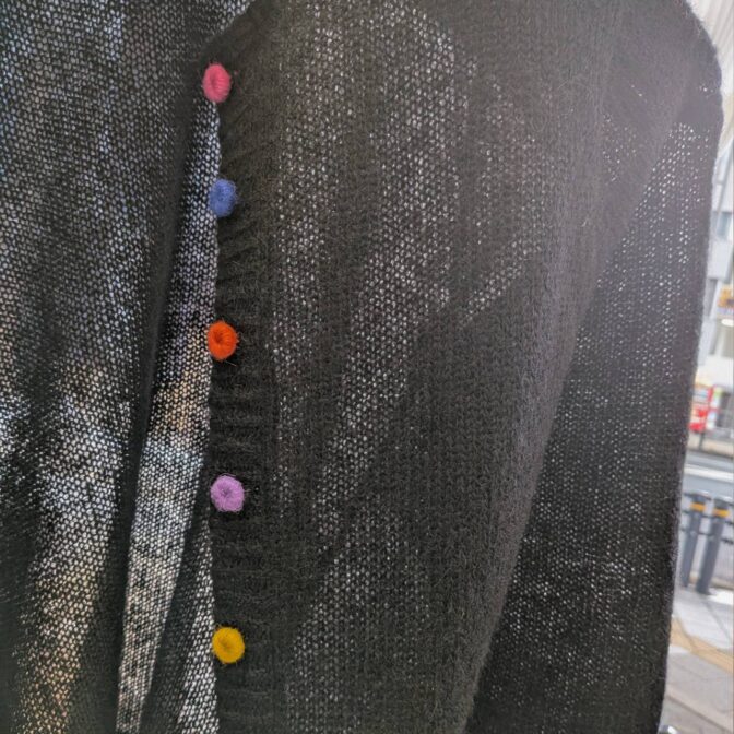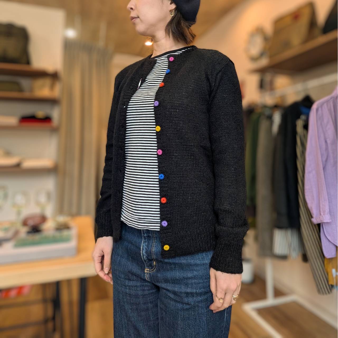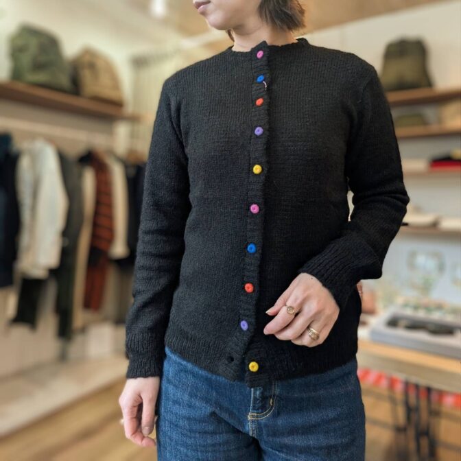 カラフルな色合いも魅力で、コーディネートの主役として長く愛用できるカーディガンです。