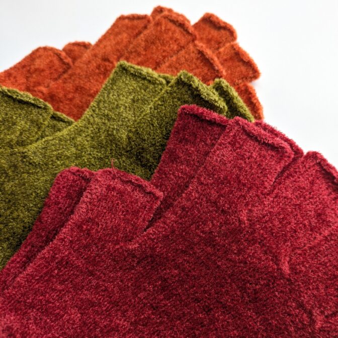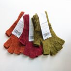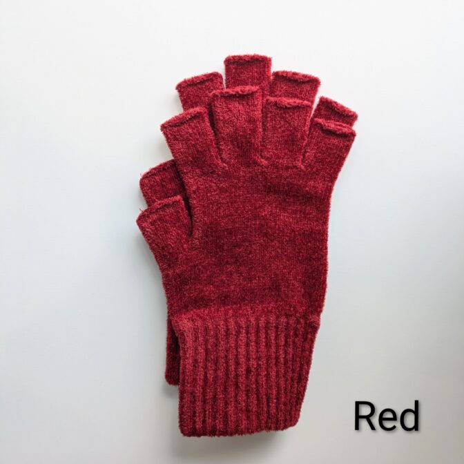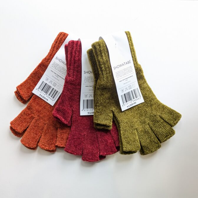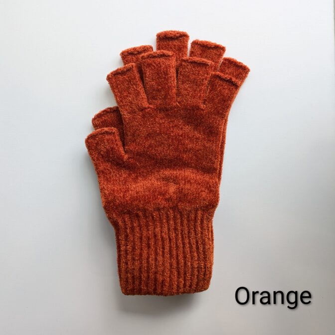 モール糸でラッセル編みした、まるで高級ベルベットのような質感の指先なし手袋。