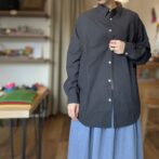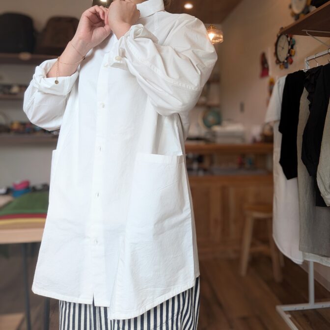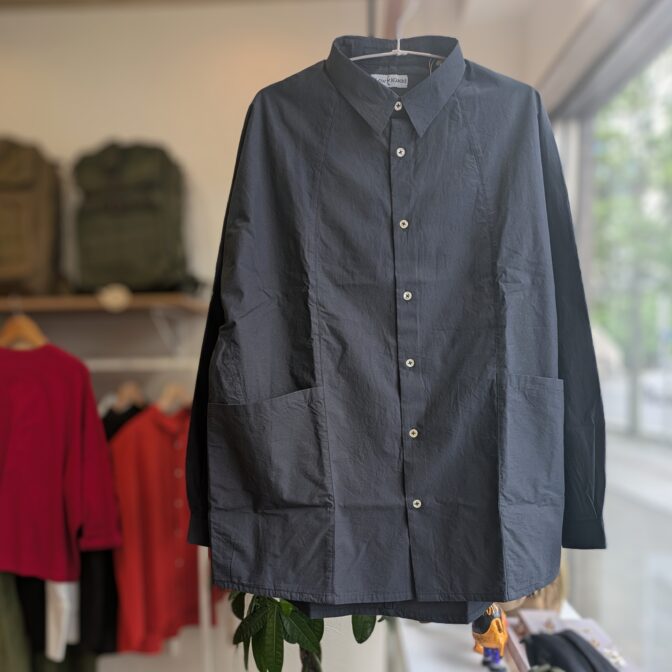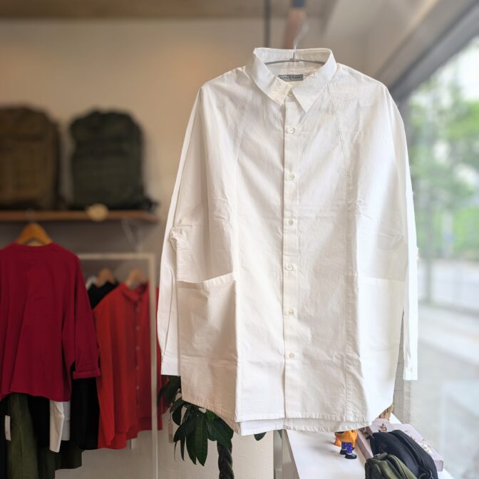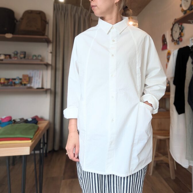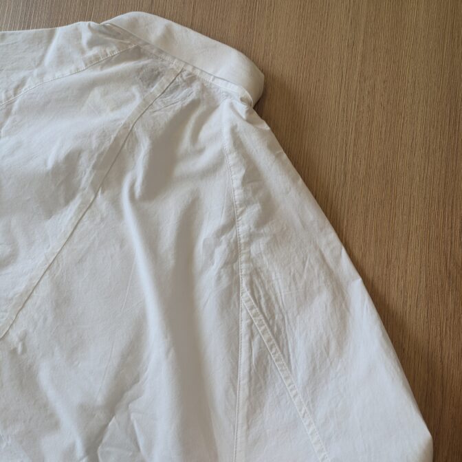 小さめの襟に、肩がなく首から袖にかけて生地がつながったラグランスリーブ仕様のシャツです。
