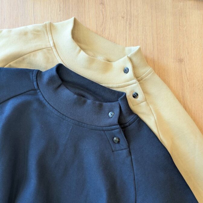 首元を高く設定したモックネックに、着脱がしやすいよう左にはボタン付き。