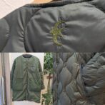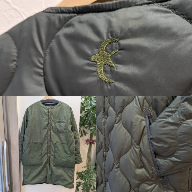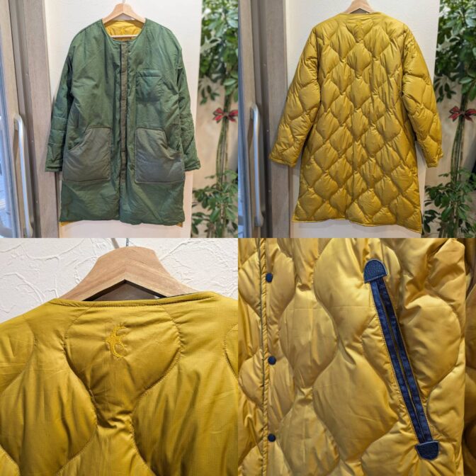 アーミーテントをリメイクしたカーキ色と、オニオン型ステッチを施した高密度ナイロンの光沢が目を引くリバーシブルタイプのダウン。