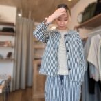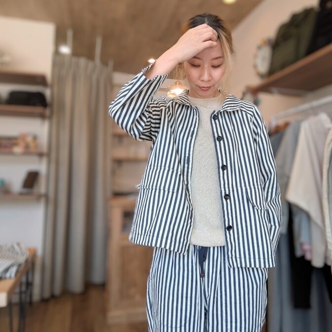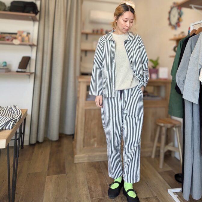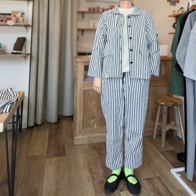 同素材のヒッコリータゴサクロングパンツとのセットアップスタイルも◎。