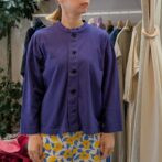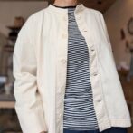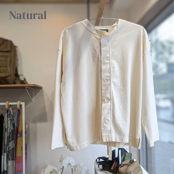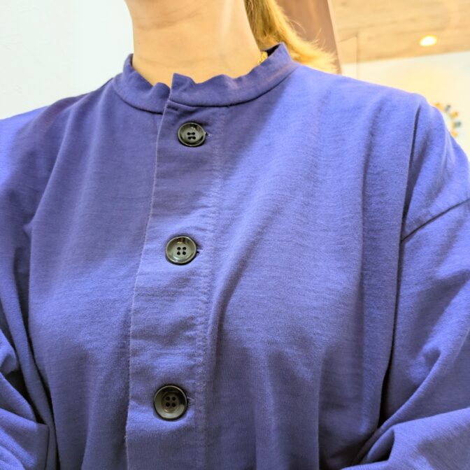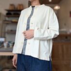 首元は少し立ち上がり、たっぷりと取られた身幅で、やや厚手のインナーの上からもすっきりと羽織れる作りです。