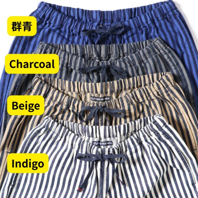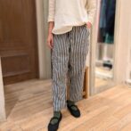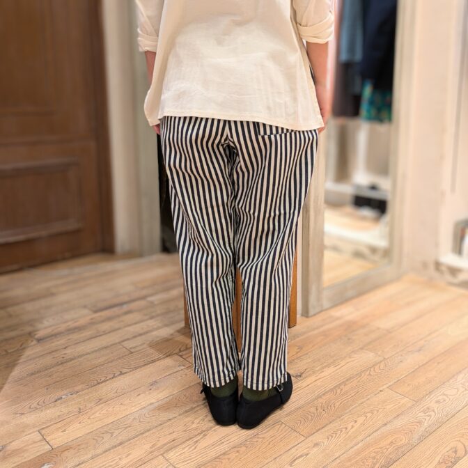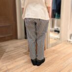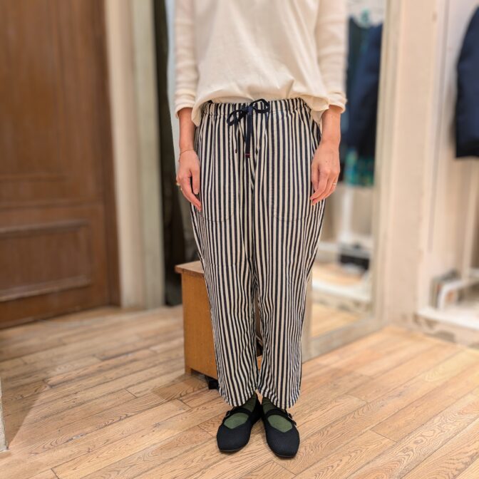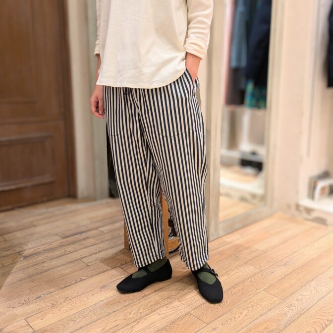 ほどよくゆったりとしたティグルブロカンテ定番のタゴサクパンツから、インディゴの糸を使用したヒッコリーストライプの登場。