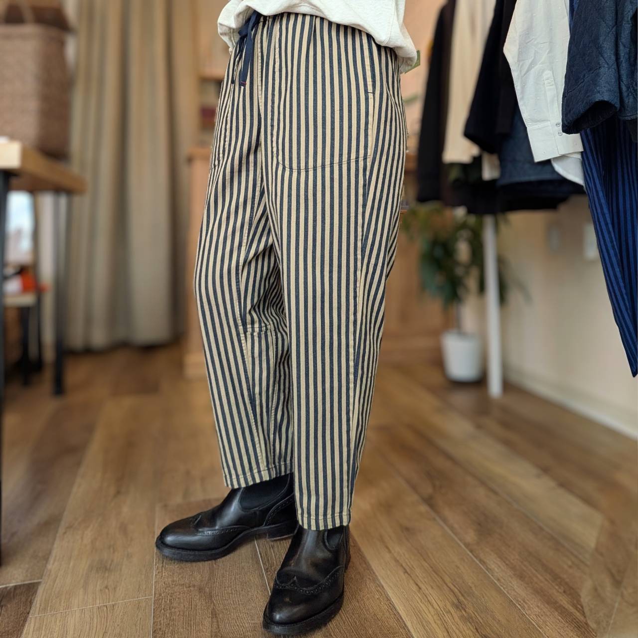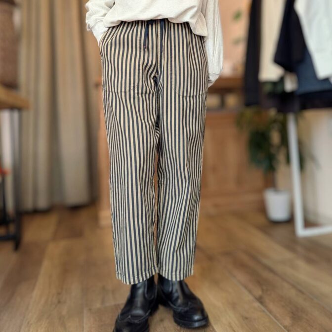 ほどよくゆったりとしたティグルブロカンテ定番のタゴサクパンツから、インディゴの糸を使用したヒッコリーストライプの登場。